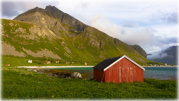 Da das Licht gerade nicht zum Fotografieren taugt, werden alle in Frage kommenden Spots zunächst nur in die Karte eingezeichnet. So können wir für den Fall, daß schönes Wetter angesagt wird, unsere Touren gut vorausplanen, damit wir dann nicht unnötig Zeit auf der Suche nach guten Locations verlieren. Das Dorf Flakstad selbst besteht lediglich aus einer Handvoll Häusern. Am Ortsrand findet man eine schnucklige kleine rote Holzkirche, die abends sicher ein hervorragendes Motiv bietet. Neben der kleinen Siedlung Bø, wo sich ein paar Holzhäuser vor einer riesigen Felswand ducken, lohnt sich vor allem der Ausflug zum See Storvatnet. Dieser liegt windgeschützt zwischen über 900 Meter hohen, senkrecht abfallenden Felswänden. Gigantisch! Das ruhige Wasser eignet sich perfekt, die Spiegelung der Felsen zu fotografieren.