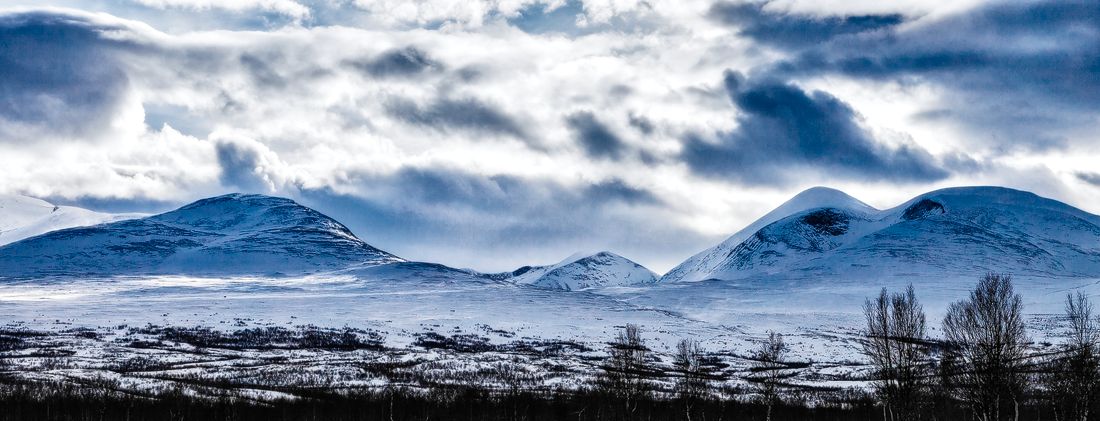 Das strengt ganz schön an, zumal man gelegentlich auch die Latten abschnallen muß, weil ein steiler und vereister Anstieg besser zu Fuß zu bewältigen ist. Nach einer Stunde haben wir einen Punkt mit ziemlich guter Aussicht erreicht. Ab hier geht es dann nur noch leicht bergan, durch Birkenwald, immer parallel zum Fluß. Unterwegs knipsen wir die historischen Fotos, da Lukas und Micha Klamotten anhaben, die man zu Recht als zeitlos bezeichnen kann. Kurz darauf treffen wir auf den entscheidenden Wegweiser, der aus dem One-way-Track einen Rundkurs werden läßt. Und ab hier geht es immer sanft bergab. Mehr oder weniger. Mitunter sind schon ein paar steile Stellen darunter, die auch ihren Tribut fordern – aber niemand verletzt sich ernsthaft. Und die bombastische Aussicht auf die Berge von Lapporten entschädigt für die Anstrengungen des Aufstieges. Wieder unten im Tal angekommen, überqueren wir den vereisten Fluß an der Stelle, wo wir gestern unser Lagerfeuer entfacht hatten. Ab jetzt können wir dem gut markierten Winterweg zurück Richtung Abisko folgen. Lediglich die letzten paar Kilometer auf dem verharschten Schneepfad des Kungsleden sind dann wieder etwas anstrengender. Aber das Ziel liegt ja schon unmittelbar voraus…